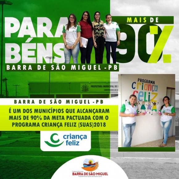 Barra de São Miguel - PB é um dos municípios que alcançaram mais de 90% da meta pactuada com o Programa Criança Feliz (PCF)/Primeira Infância no Sistema Único de Assistência Social (SUAS) 2018, segundo a Secretaria Nacional de Promoção do Desenvolvimento Humano. Este resultado está disponível na página do Ministério do Desenvolvimento Social (MDS) em uma lista que mostra Barra entre os 96, dos 223 municípios paraibanos, e os 1.131, dos 5.570 municípios brasileiros, que conseguiram este resultado.