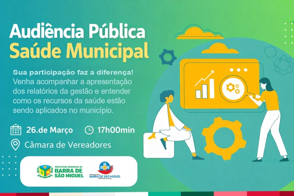 A Prefeitura de Barra de São Miguel por meio da Secretaria Municipal de Saúde promove, na próxima quinta-feira, 26 de março, às 17h, na Câmara de Vereadores, uma Audiência Pública para apresentação do 1º, 2º e 3º Relatórios Detalhados do Quadrimestre e do Relatório Anual de Gestão 2025 da Saúde Municipal.