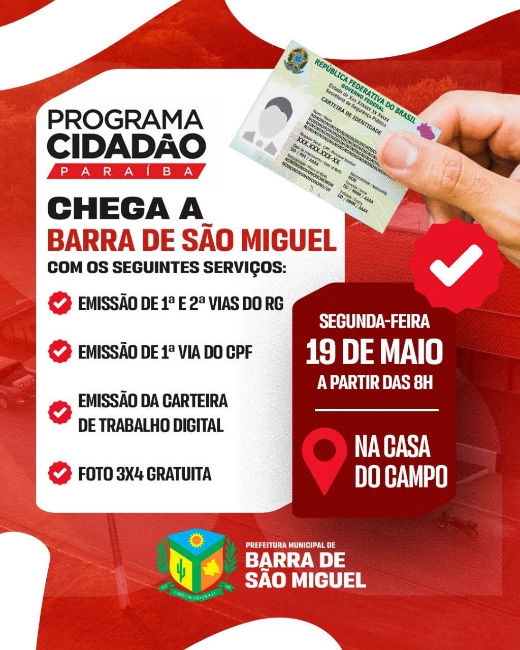 Barra de São Miguel, PB – Na próxima segunda-feira, 19 de maio, a população de Barra de São Miguel contará com uma grande ação de cidadania. A partir das 8h da manhã, a Casa do Campo será o local onde diversos serviços gratuitos de documentação estarão disponíveis para os moradores.
