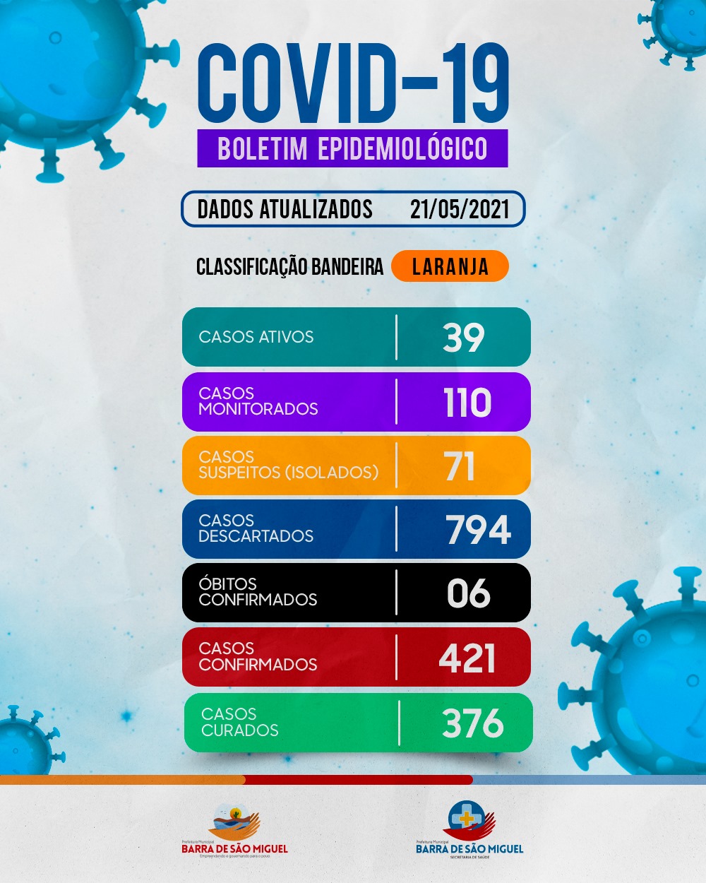 A Prefeitura Municipal de Barra de São Miguel, por meio da Secretaria Municipal de Saúde, vem nesta sexta-feira (21/05), divulgar mais um boletim informativo sobre a Covid-19.
