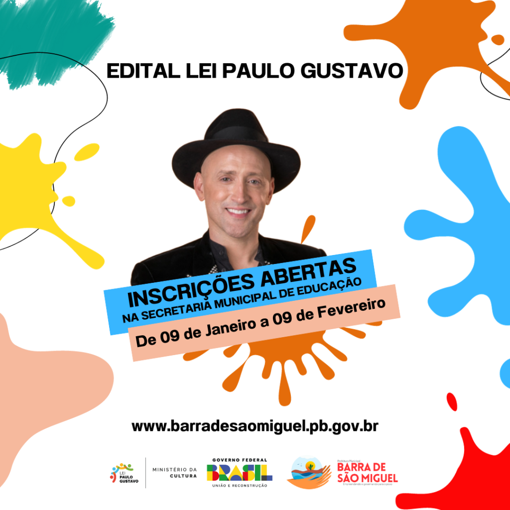 A Prefeitura Municipal de Barra de São Miguel, através da Secretaria de Cultura, Lazer, Esporte e Turismo, comunica a todos os artistas que as inscrições do edital da Lei Paulo Gustavo estão abertas de 09 de janeiro a 09 de fevereiro.